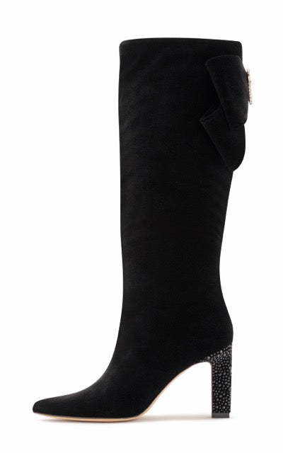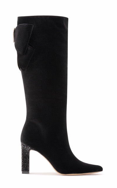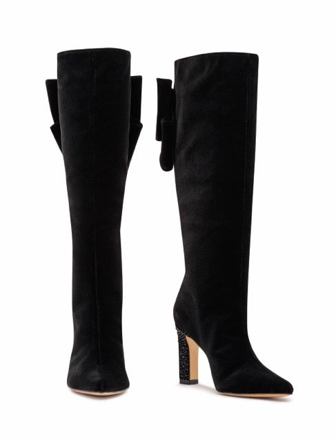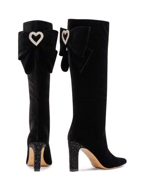 You thought you've seen it all! This stunning German velvet knee high boot will keep turning heads anywhere you go. Beautiful heel wrapped with intricate crystals and a velvet bowtie on the back with a heart shaped broche accent - it's designed to perfection.