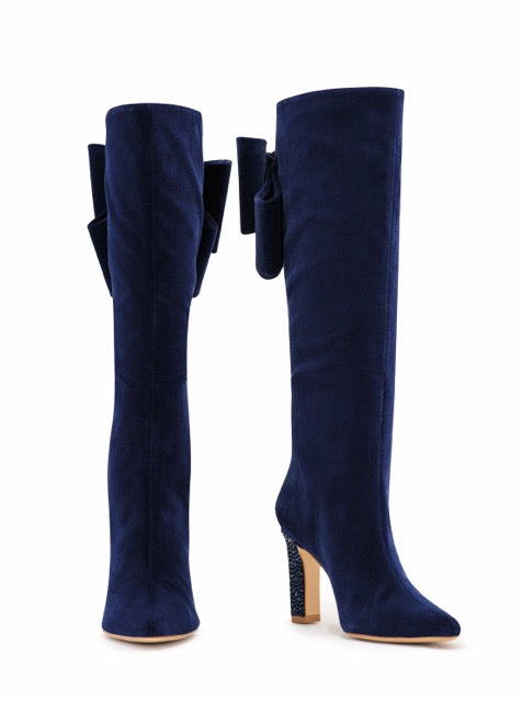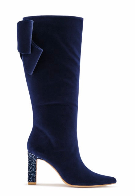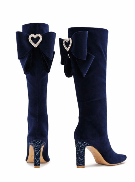You thought you've seen it all! This stunning German velvet knee high boot will keep turning heads anywhere you go. Beautiful heel wrapped with intricate crystals and a velvet bowtie on the back with a heart shaped broche accent - it's designed to perfection.